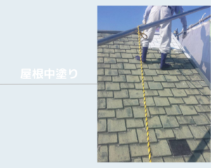 屋根塗装は、一般的に下塗り、中塗り、上塗りの3つの工程で行われますが、今日はその中の中塗り作業をしました。